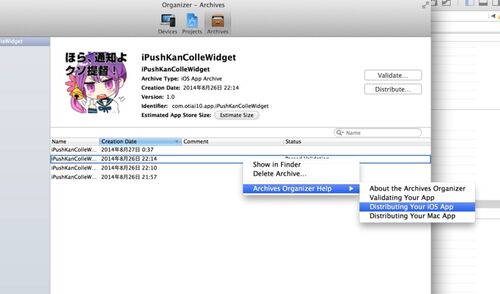 メモ iPhoneアプリ、公開用ビルド作成までの手順 - えんたつの記録 Xcode4でiPhoneアプリをiTunes Connectに登録する方法 - えんたつの記録 【iPhone】XcodeでArchiveが選択出来ない No application records were found. - その場しのぎであたふたと App Sto…