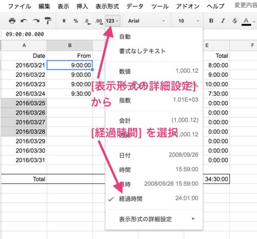 小一時間くらい探しまくって疲れたのでメモ まとめ 表示形式の詳細設定から経過時間を選択 ふつーにエクセルっぽくSUMする 表示形式の詳細設定から経過時間を選択 この123って書かれてるところ これでほとんどできたようなもの エクセルっぽくSUMする 行の合…
